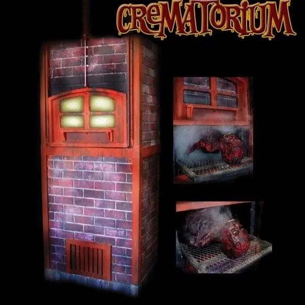 A rustic 7 ft tall brick crematorium stands tall with a crackling furnace sound effect emanating from within. Suddenly the rusty door slides upward as a blast of smoke pours out. From inside, a burned corpse slides outward repeatedly, with a blood curdling scream. The Crematorium breaks down for shipment and includes a four channel controller, Martin fog machine, vortex nozzle, and amplified speaker.