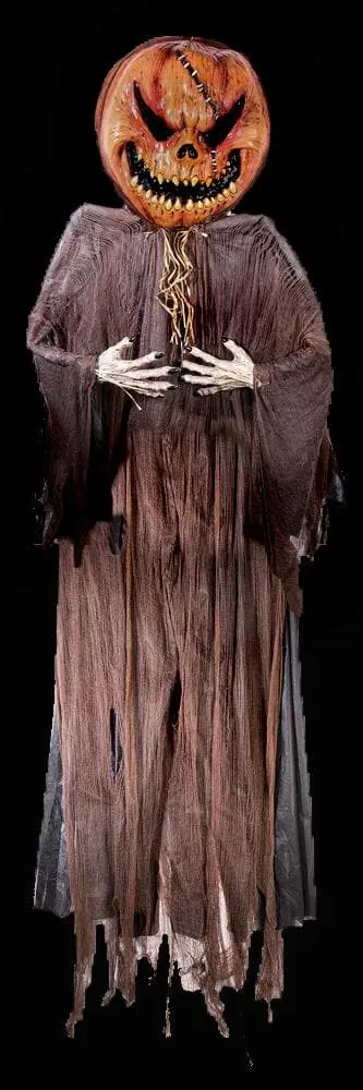 Gruesomely scary enormous pumpkin head with wire frame arms that are poseable and long flowing gauzy clothes. The head measures 23.5 inches from top to bottom, 22 inches from left to right and 9 inches deep. The total arm span is an impressive 98 inches. The hands are 12 inches long. The scary pumpkin prop is a spine-chilling 12 feet tall and is designed to be hung up. An awesome addition to your Halloween decor. Hanging Prop.