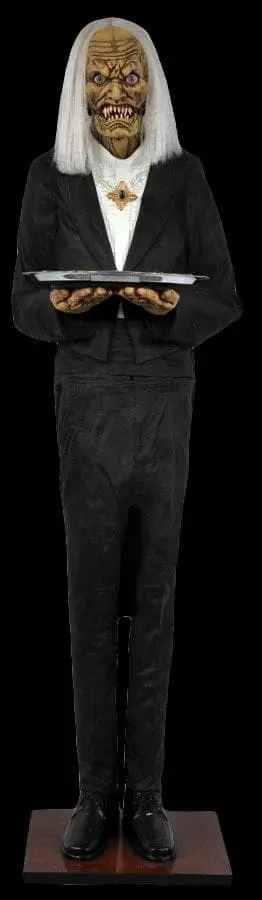 Here is a butler who can welcome your guests to your haunted gathering! Life-sized figure in a black tux with white shirt and medallion necklace shakes in an eerie way! His creepy face and sharp teeth clacking together will scare the yell out of you! Plugs into any 110 outlet. For indoor or covered porch use only. Height is 6ft 1 inch x width 21 inches x depth 18 inches.