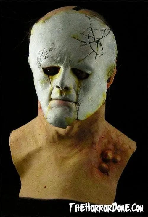 The Doll Face Halloween mask from The Horror Dome is actually two designs in one. There’s a grotesque over the head mask featuring open wounds, thin, wiry hair, burned flesh and puss-filled blisters, and an attachable porcelain-style doll mask, meant to spare the passerby the sight of his horrible disfigurement.