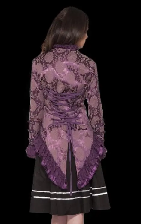 Our stunning jacket is made from luxurious brocade fabric and features a scooped v neck collar with lace trim. Â Military style metal button detail on the front and sleeves. Â Bell Sleeves with lace and ruffle trim. Â The back of the coat has a criss-cross lace-up style with long coat tail and lace ruffle trim. Â Available in Black and Purple.